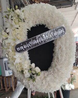 พวงหรีดดอกไม้สดโทนฟ้าขาว