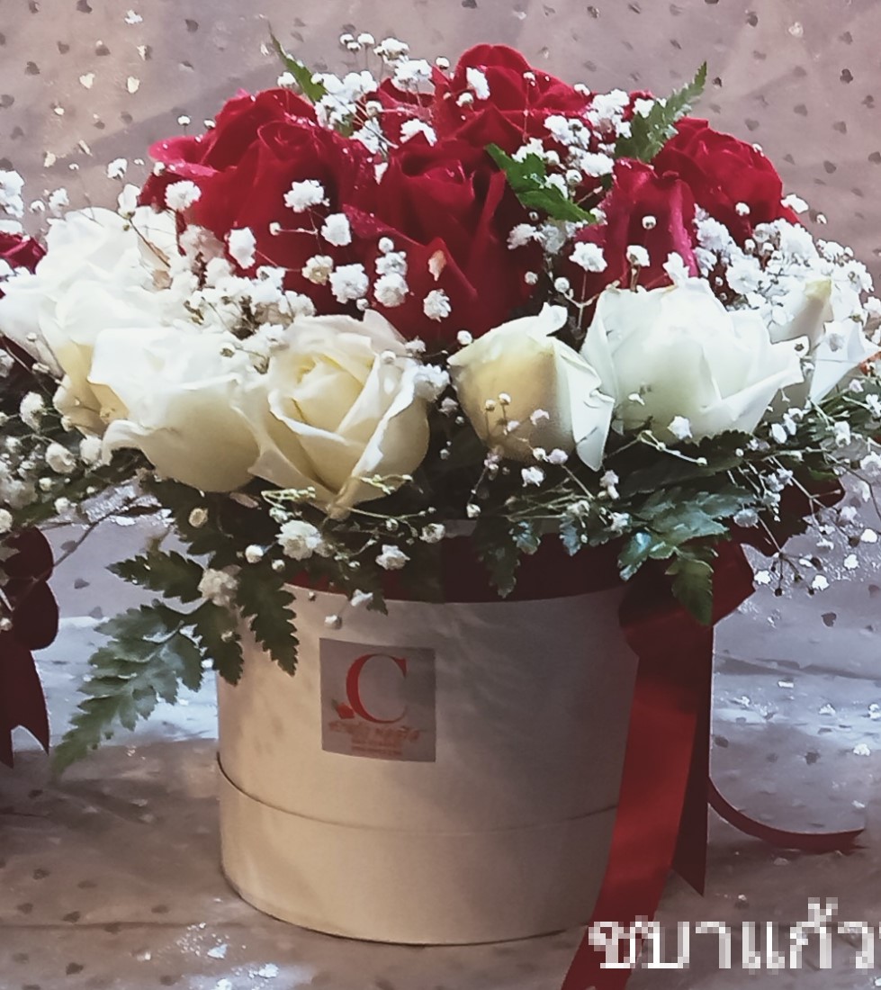 กล่องดอกไม้สด กลม ขนาด 15×16 เซน ใส่ดอกกุหลาบสีขาวและสีแดง กับคัดเตอร์หรือยิปโซสีขาว ผูกโบว์สีแดง